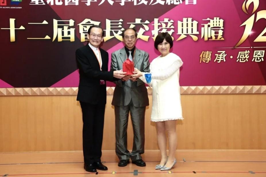 台北醫學大學校友總會上午舉辦第12屆會長交接典禮,左為前任會長杜元坤,右為新任會長李靜蘭。圖/北醫校友總會提供
