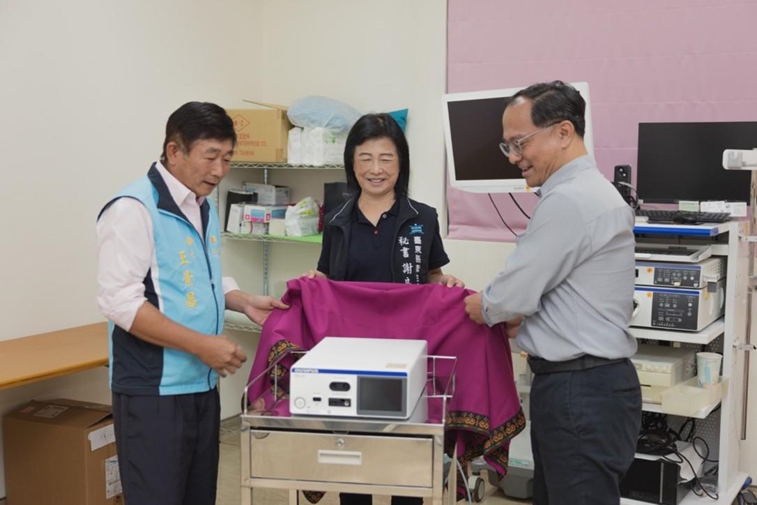 圖二:南迴基金會高元院長(右)、臺東縣衛生局謝良英秘書(中)與大武鄉王景昌鄉長(左)共同揭幕市值 70 萬元的 OLYMPUS ESG-150 內視鏡專用電燒灼機。